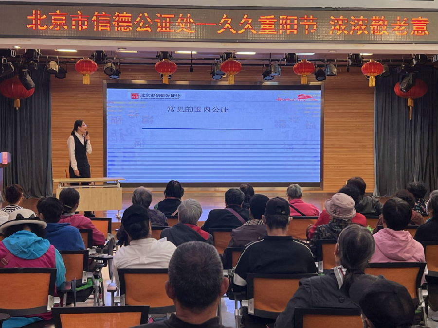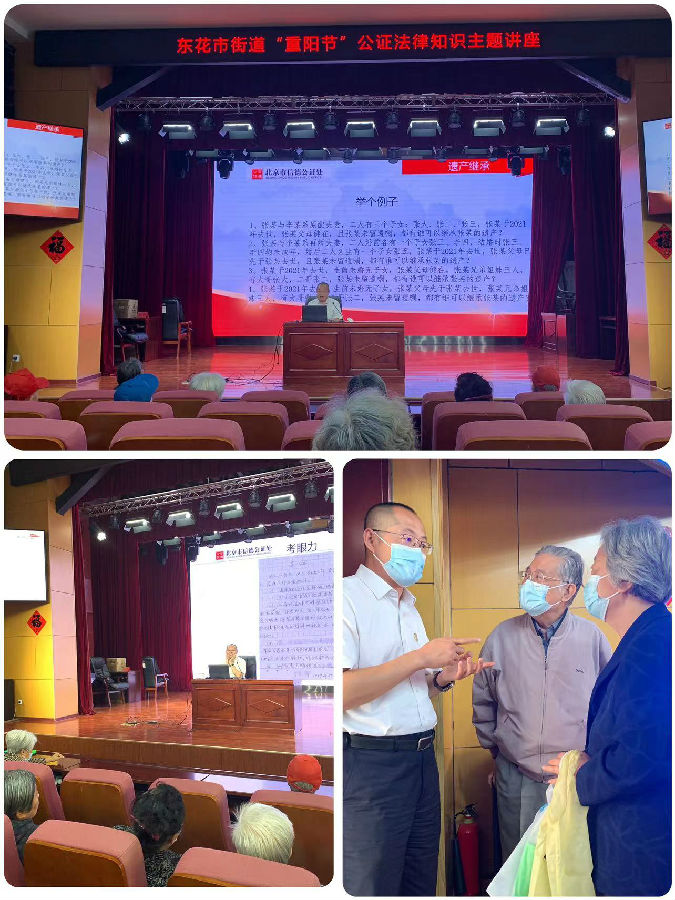 选派经验丰富的公证人员前往东花市街道、体育馆路街道、崇外街道、前门街道开展重阳节公证法律宣传活动,通过普法讲座、普法宣传等形式就老年人关心的遗嘱、继承、委托等公证事项进行详细讲解,用通俗易懂的事例与老年人开展现场互动问答,发放公证知识宣传手册向老年人传递法律知识;宣讲结束后,现场为老年人进行公证咨询,并提供预约服务,以实际行动解决老年人最急切、最困难的问题。