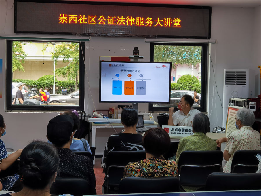 8月26日,我处公证员范洋来到崇西社区,为社区居民开展公证法知识讲座,对公证法发展的沿革、常用民事公证业务进行介绍,对遗嘱、继承、居住权等受理条件、办理流程等进行详细讲解,在公证员用PPT展示讲解遗嘱规范模板时,居民们纷纷拿出手机拍摄留存。为让本次活动取得实际效果,公证员还与居民进行现场互动,通过引入真实案例的方式,生动地讲解了复杂遗产继承公证中第一、第二顺位继承人的确定和转继承、代位继承的适用,并以提问形式检验居民的收听效果,居民们踊跃回答,纷纷表示上了一堂生动的普法课。讲座结束后,公证员为有需求的居民提供咨询、预约服务。